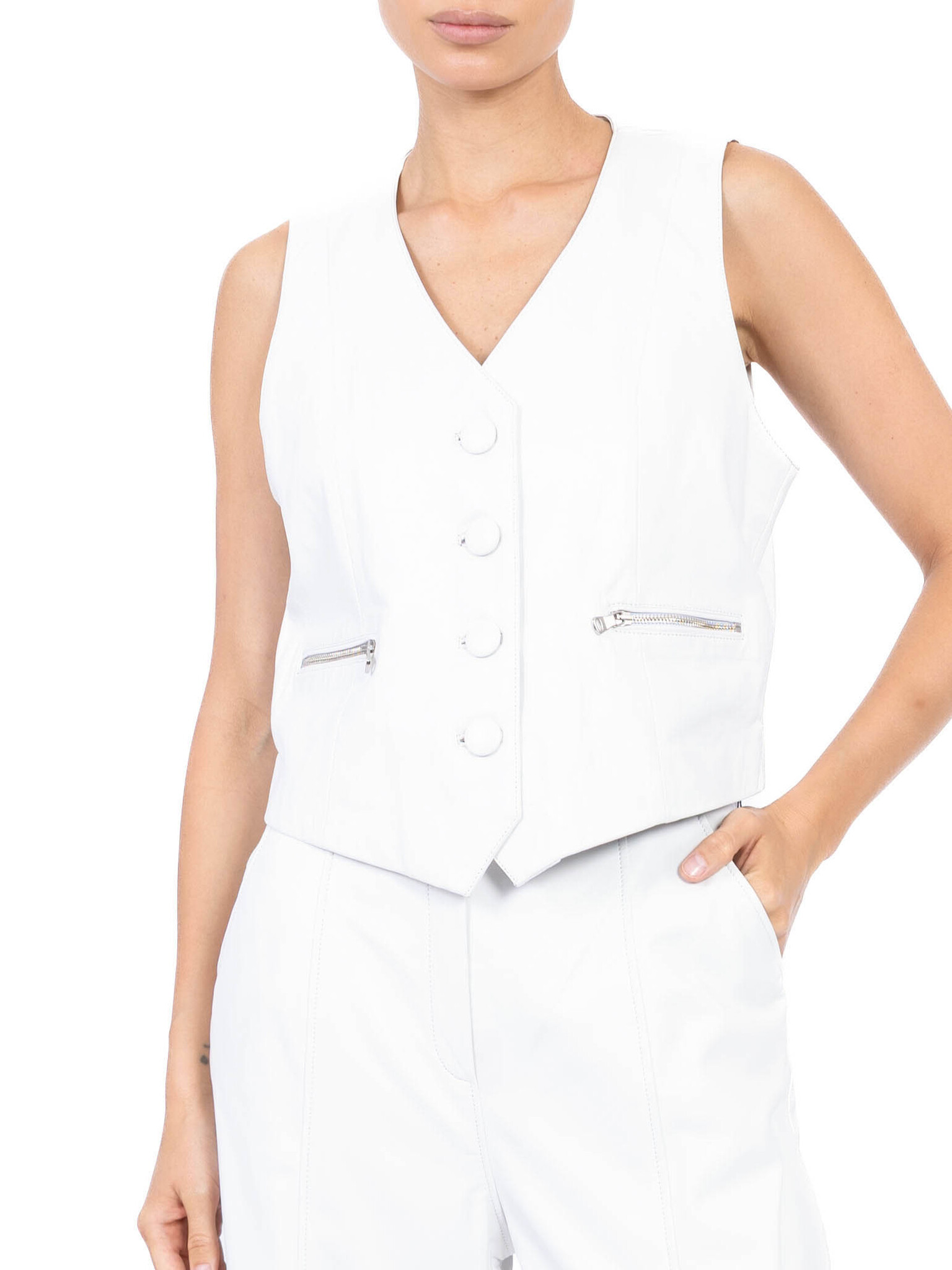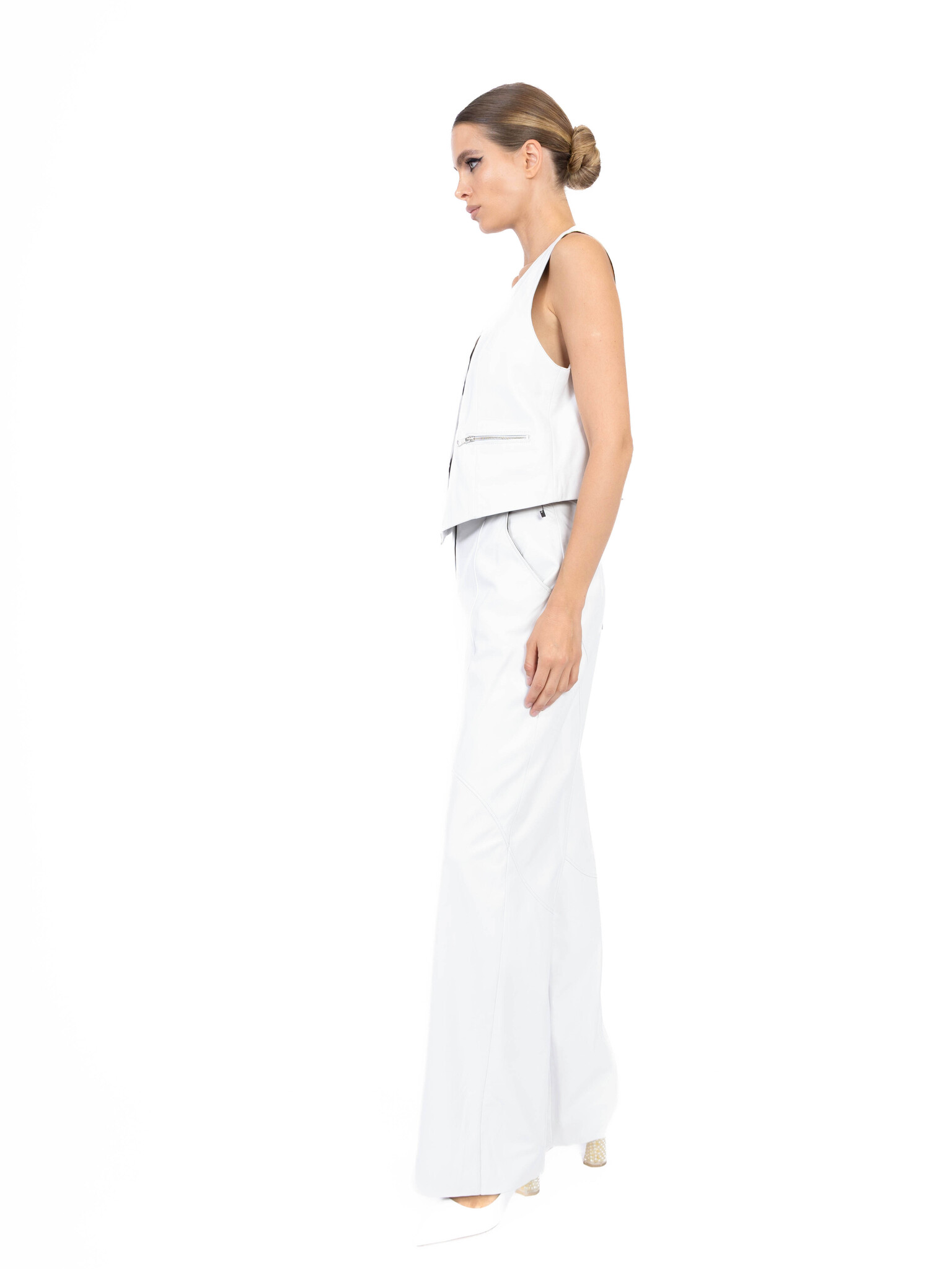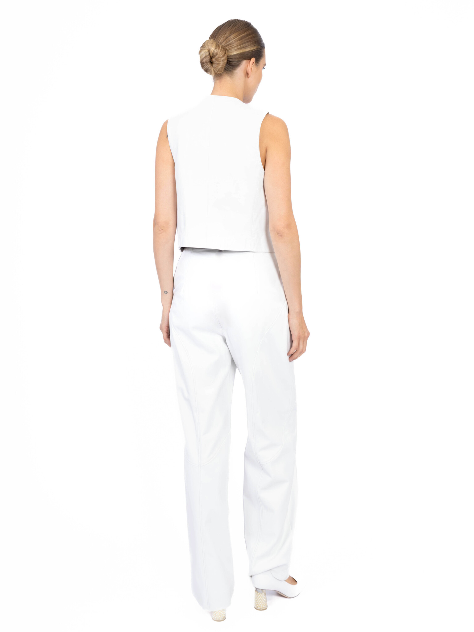 Женские кожаные брюки белые прямого кроя от Дом Моды «ANIKA KERIMOVA». Фасон отличается современным минимализмом и универсальностью: прямые линии и удлинённый силуэт визуально вытягивают фигуру, а высокая посадка подчеркивает женственность. Белый оттенок добавляет чистоту и благородство образу, делая изделие акцентным элементом гардероба.